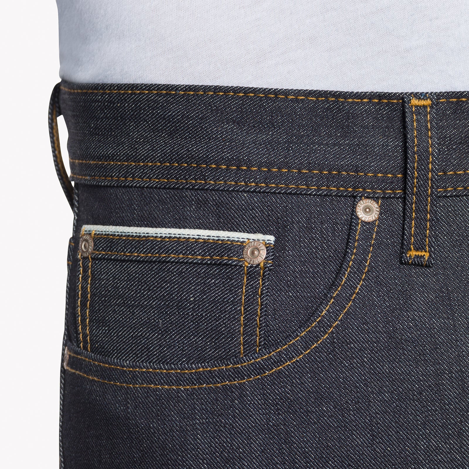 The Left Hand Twill Selvedge is a 13.75 oz indigo rope-dyed Japanese denim woven on vintage shuttle looms in a left-hand twill construction. When worn over time, this construction will provide a softer denim hand and accentuate the vertical fading. Other details include contrast stitching, a full-grain brown leather patch, white selvedge ID, and silver metal buttons and rivets. The Weird Guy is a regular tapered fit; mid-rise, standard thigh, and slightly tapered from knee to hem.